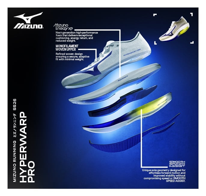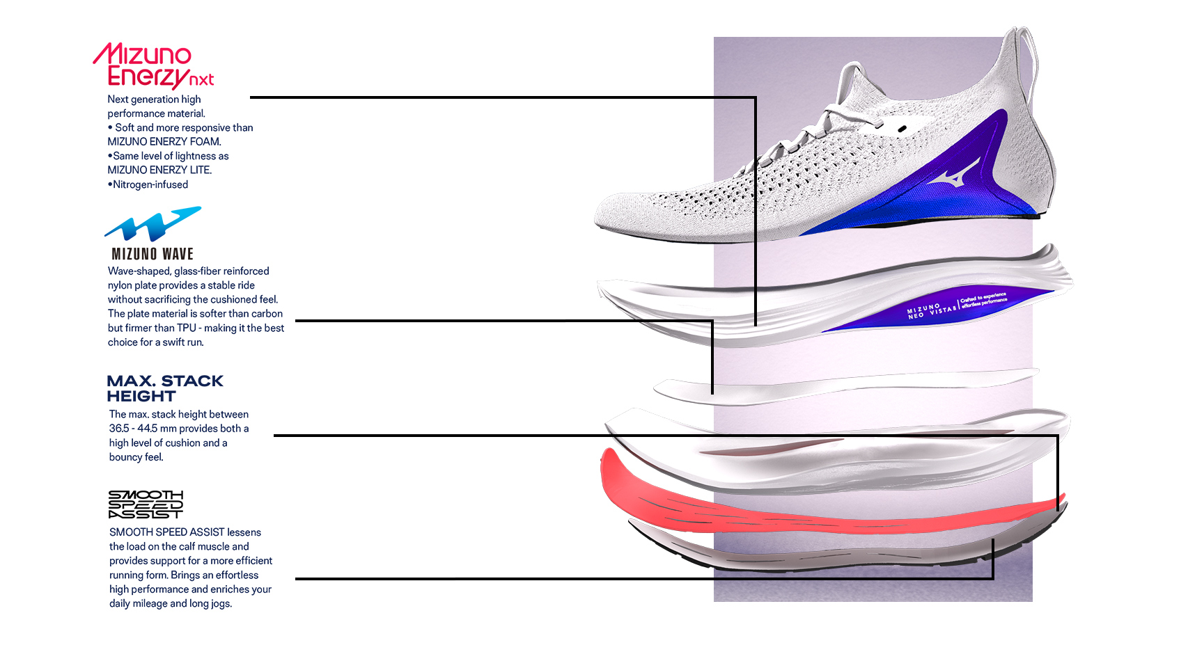 La technologie Smooth Speed Assist, développée par Mizuno, optimise la transition du pied et améliore la fluidité